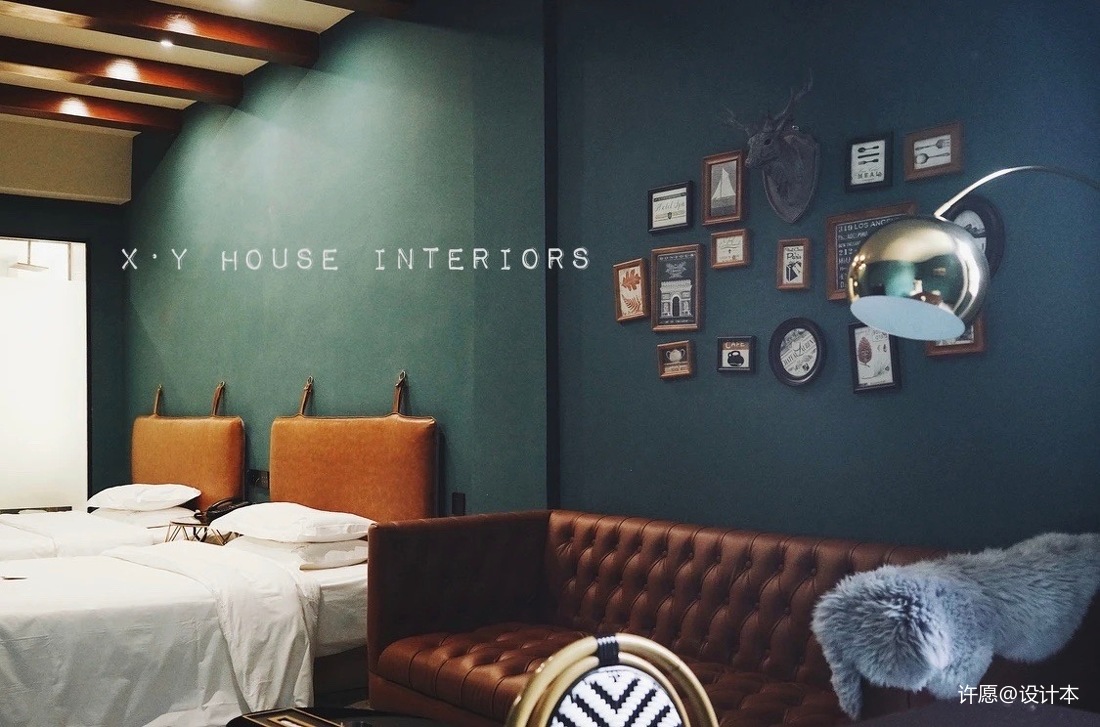 其中一套親子房設(shè)計成鄉(xiāng)村休閑風,復(fù)古木紋、石頭壁爐、咖色皮紋座椅、鏤空鹿頭、咖色地毯等同一色相不同純度、不同明度的色彩空間組合,和諧舒適, 客人在進入空間后,便能沉浸在休閑舒適的空間中,隔絕外部的繁雜。