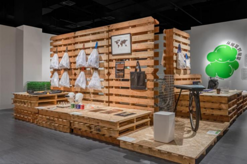 有別于ㄧ般展覽使用大量一次性耗材,「2020亞洲社會設計展」全場使用回收自過往展覽或采買自鄰近二手市場的展覽用具,以及可回收再生材及可重組再利用的展示物件。展品介紹也不再使用展板,而是用回收紙箱、可重復使用與降解的幕布等方式呈現,以社會設計的理念以實現可重復使用與零廢棄的目標。