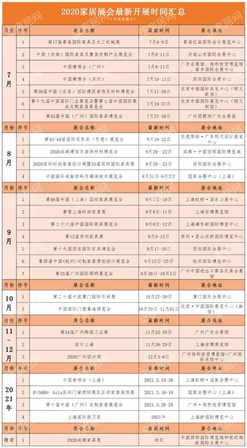 目前,2020成都國際家具展展期待定,而中國建博會(上海)、R+T&HD+ Asia亞洲門窗遮陽展及亞洲家居裝飾展、中國(廣州)定制家居展覽會、上海國際廚衛展已明確公布延期至2021年開展。以下是7月至12月已確定展期的部分展會,感興趣的朋友們可以一鍵搜藏。